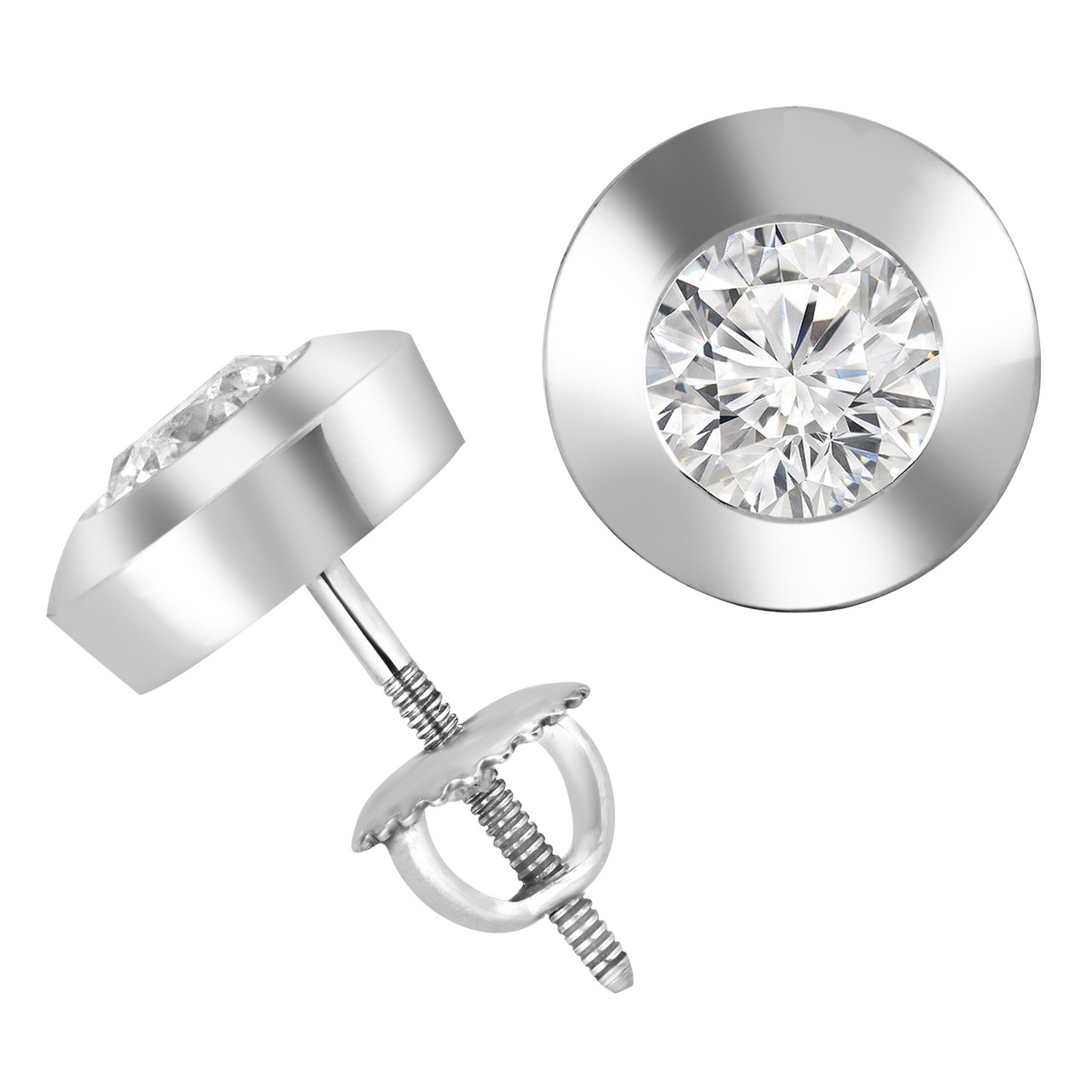 Round Cut Diamond Solitaire Bezel-Set Stud Earrings with Screwbacks in White Gold - #R457-W