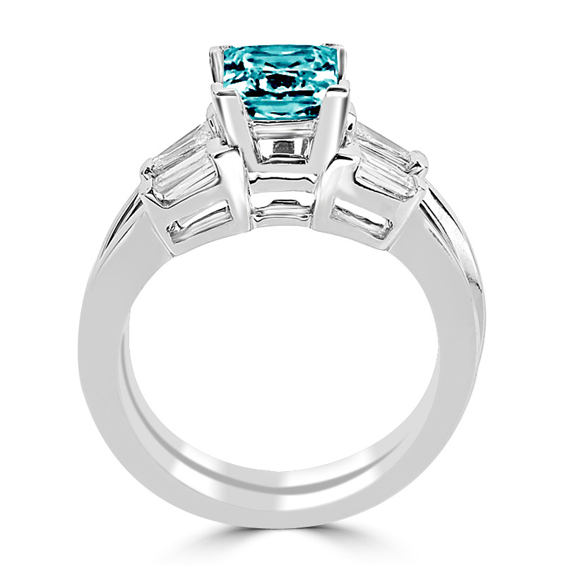 Princess Cut Blue Diamond Multi-Stone V-Prong Engagement Ring & Wedding Band Bridal Set with Baguette Cut White Diamond Accents in White Gold - #HR8092A-B-W-BLUE