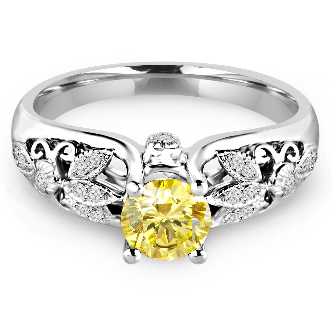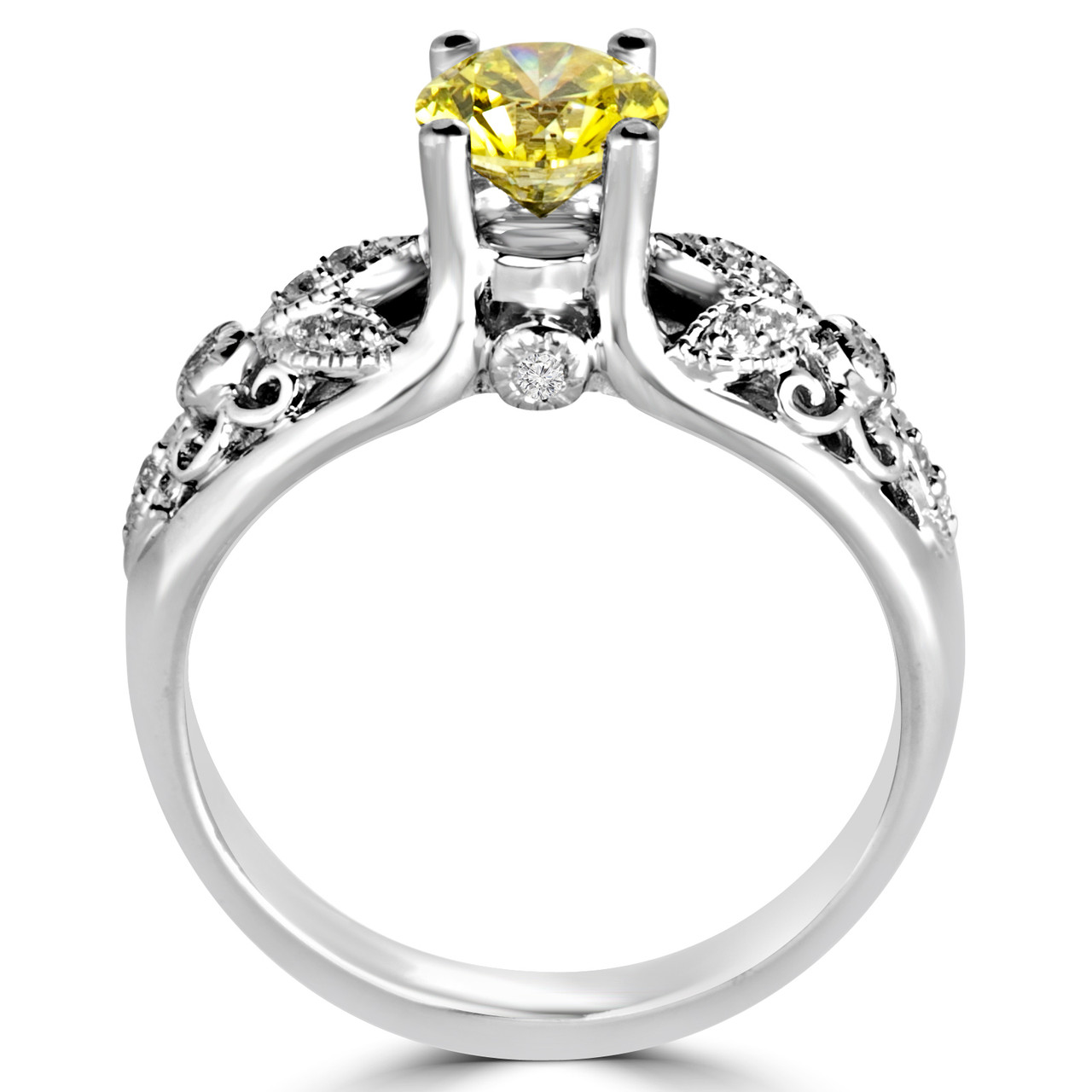 Round Cut Canary Yellow Diamond Multi-Stone 4-Prong Vintage Engagement Ring with Round White Diamond Accents in White Gold - #HR6218-W-YELLOW
