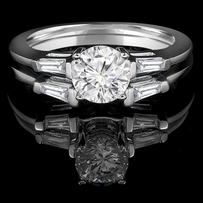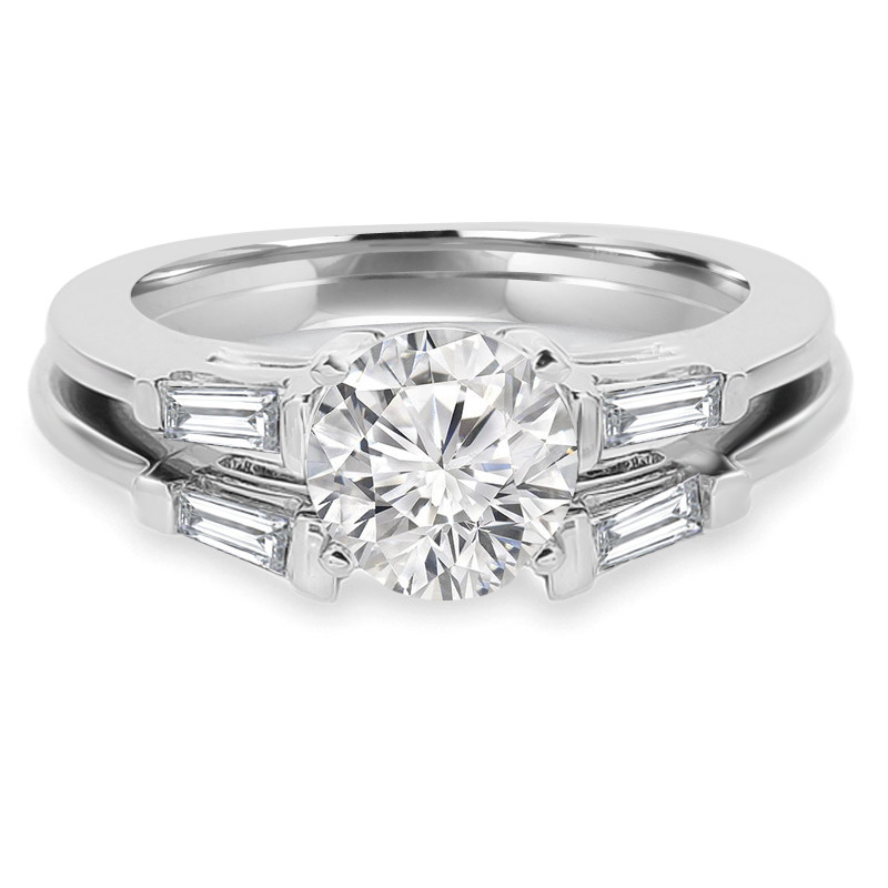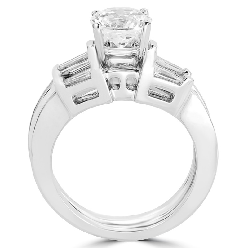 Round Cut Diamond Multi-Stone 4-Prong Engagement Ring & Wedding Band Bridal Set with Baguette Cut Diamond Accents in White Gold - #HR8090-A-B-W