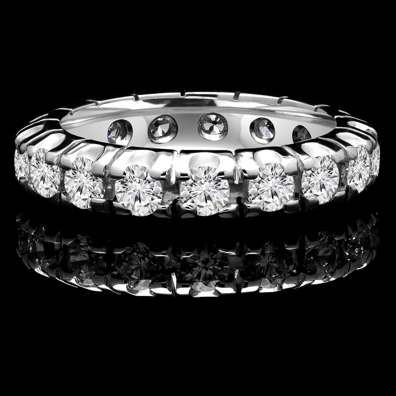 Diamond eternity wedding bands are a great way to represent the love love between you and your special someone. This spectacular ring boasts dazzling diamonds that fully encircle this 4-prong wedding band, making it sparkle from every angle! This ring will serve as a wonderful reminder of your special day.
