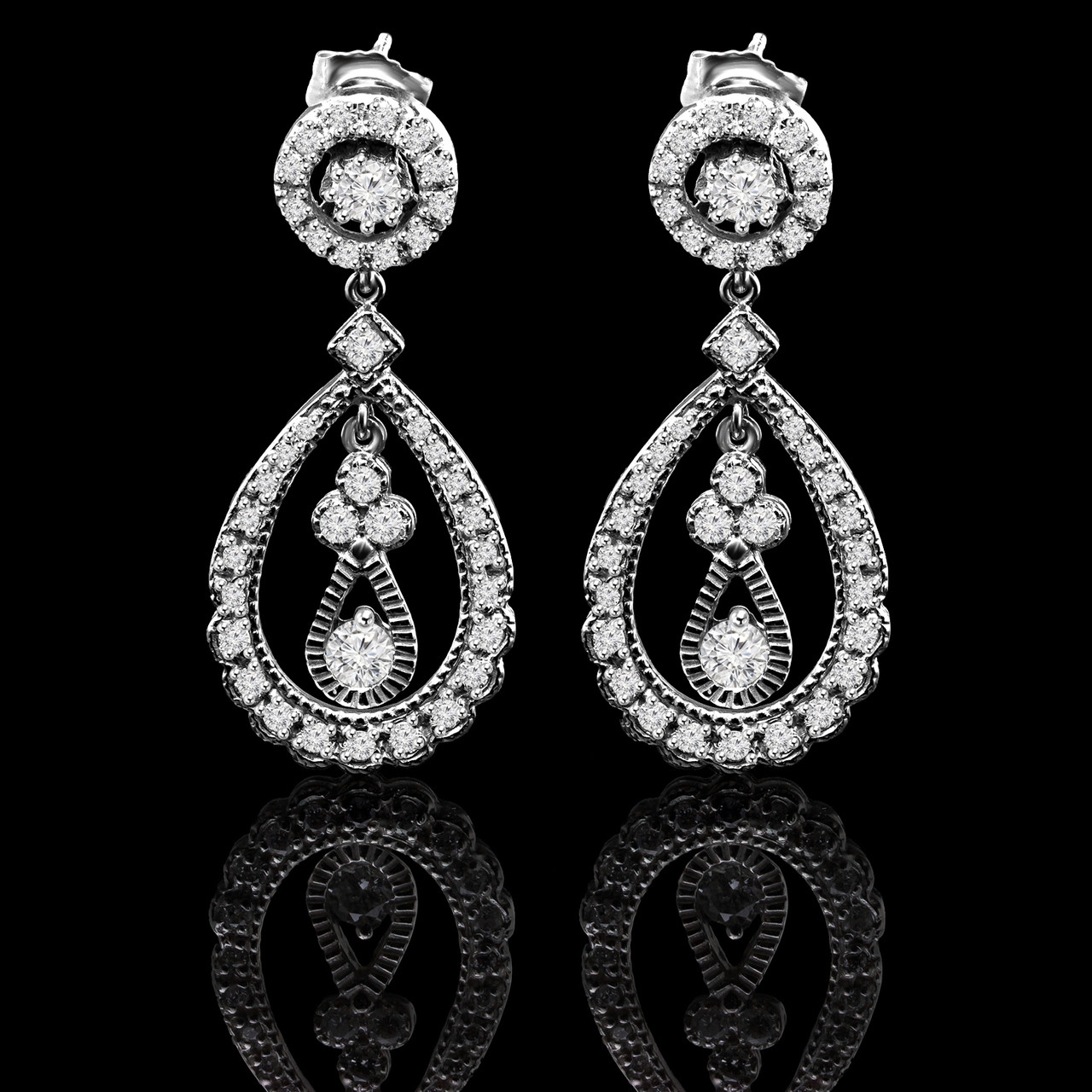 Round Cut Diamond Dangle Drop Vintage Multi-Stone Shared-Prong Teardrop Shape Earrings in White Gold - #E301