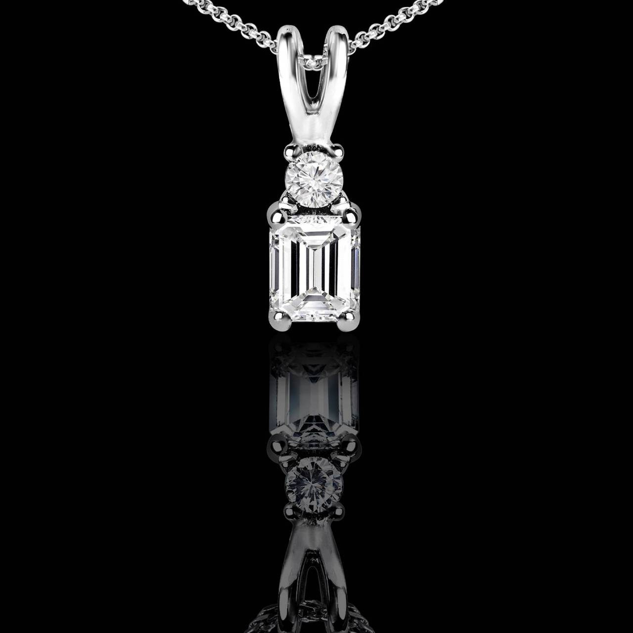 icture yourself clasping this emerald cut diamond necklace around your special someone's neck. They'll be thrilled over your kind gesture when they notice the beauty of the round and emerald-cut diamonds resting on their chest.