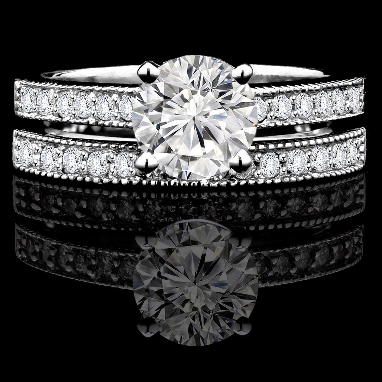 Lustrous from every angle, this engagement ring wedding band set is simply perfect! Round diamonds accent each band creating a flawless and cohesive look that brings the brilliant round-cut diamond into the spotlight.