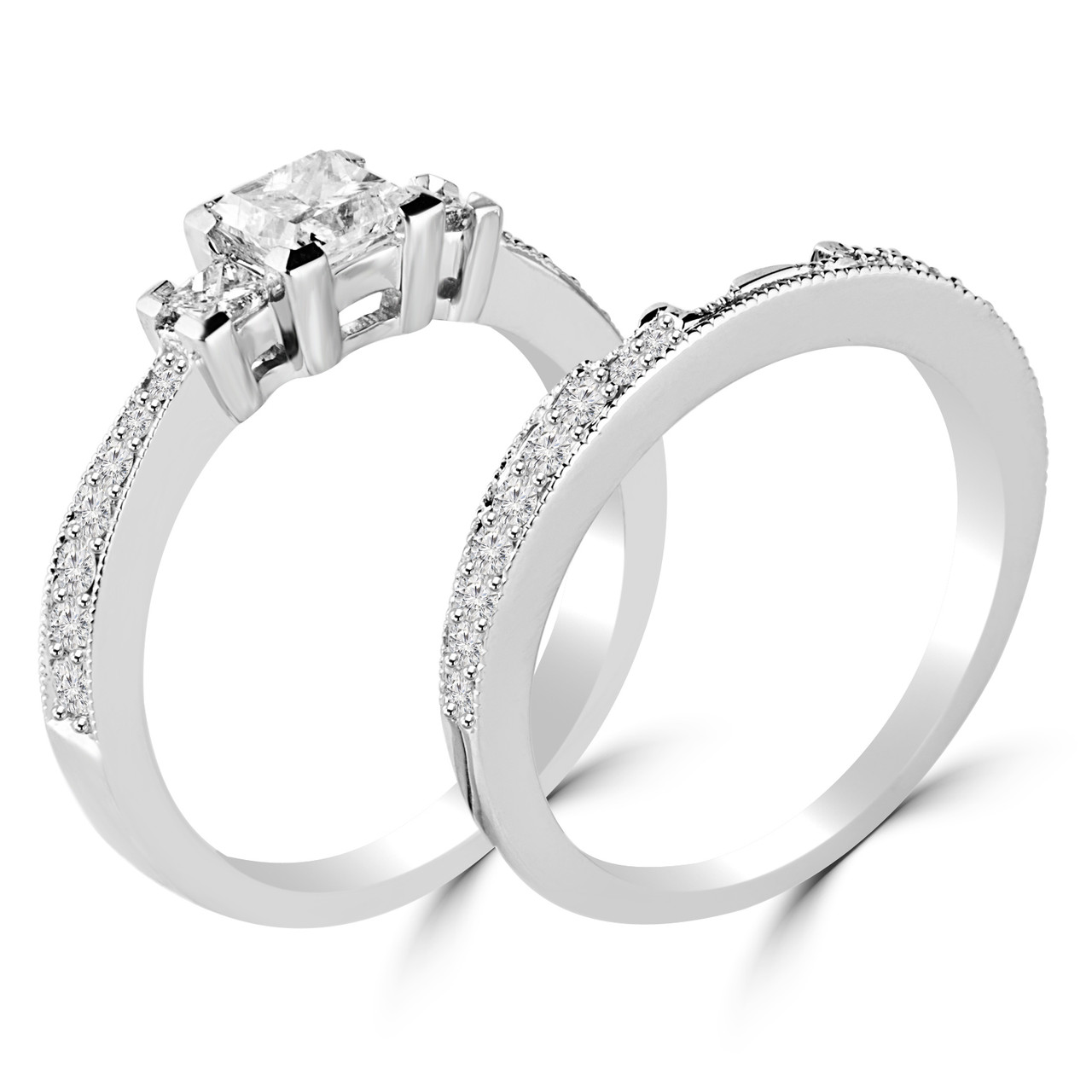With a style as fashion savvy as this engagement ring with wedding band, youll be ready to throw in the towel on your shopping extravaganza. Boasting two matching bands that flow beautifully around the engagement rings diamond centre stone, this pair is certain to make your special someone ecstatic.