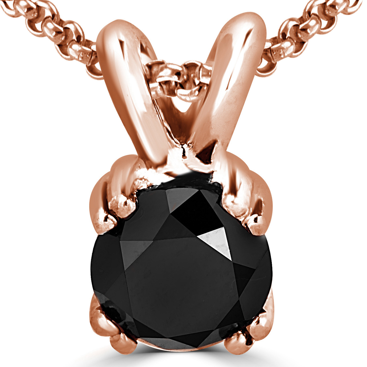 Round Cut Black Diamond Solitaire 4 Double-Prong Pendant Necklace with Chain in Rose Gold - #R790R-R-BLK