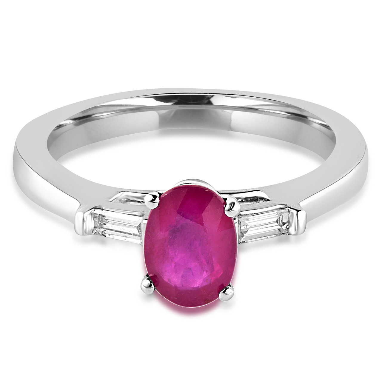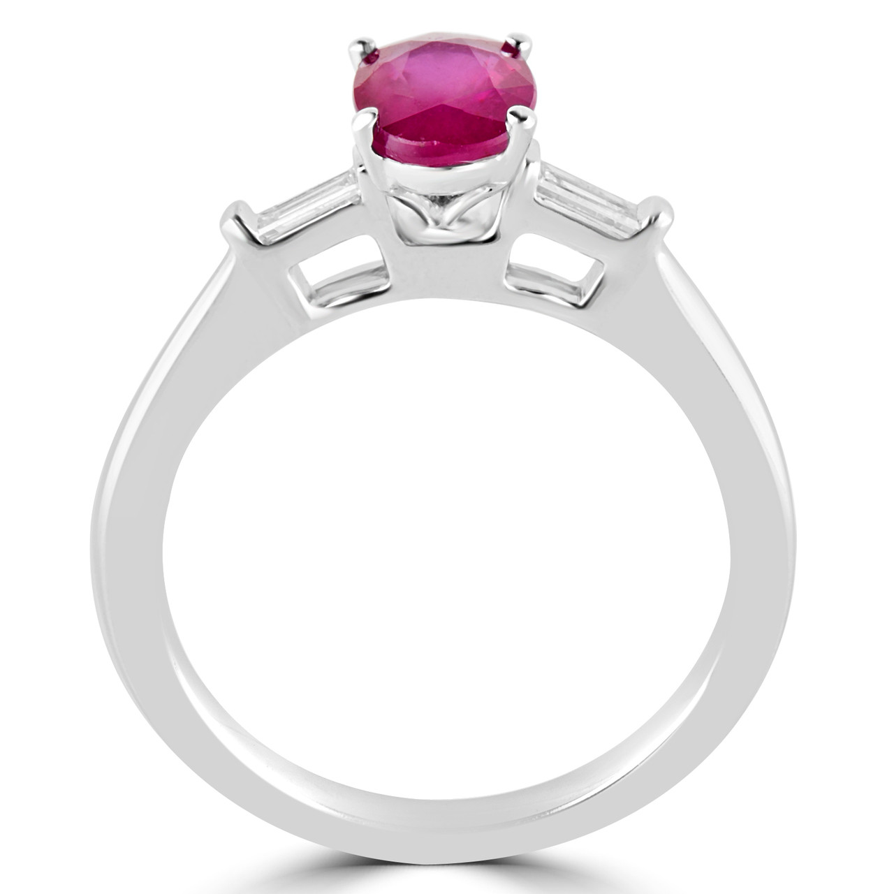 Your friends won't believe their eyes when you flash this ruby gemstone ring at them! The baguette-cut white diamond accents paired with the oval-cut red ruby is simply irresistible.